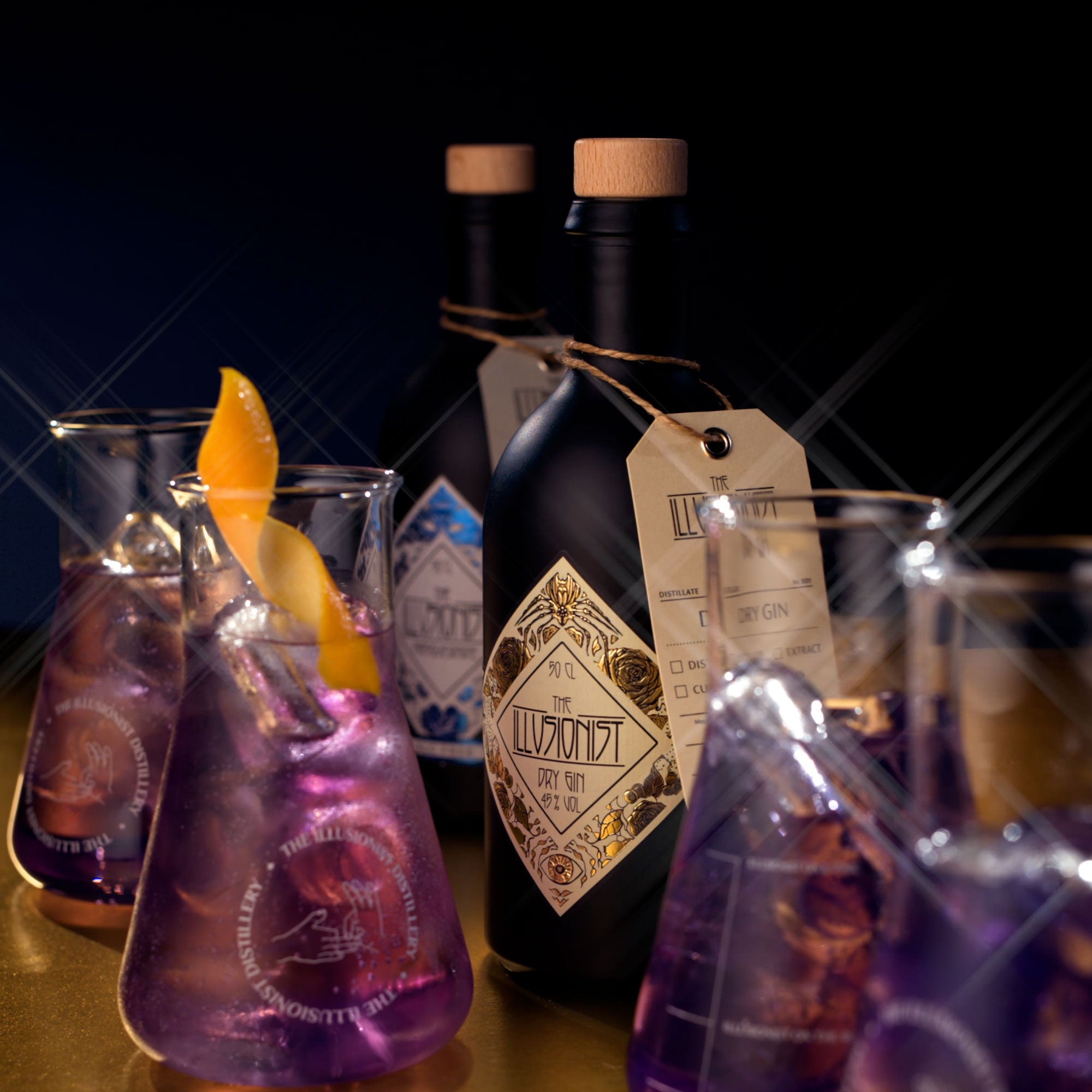 The Illusionist Dry Gin – Our maiden release, a smooth blend of 16 botanicals with fruity, floral notes and a unique colour change from deep blue to pink when mixed with tonic water or citric mixers.